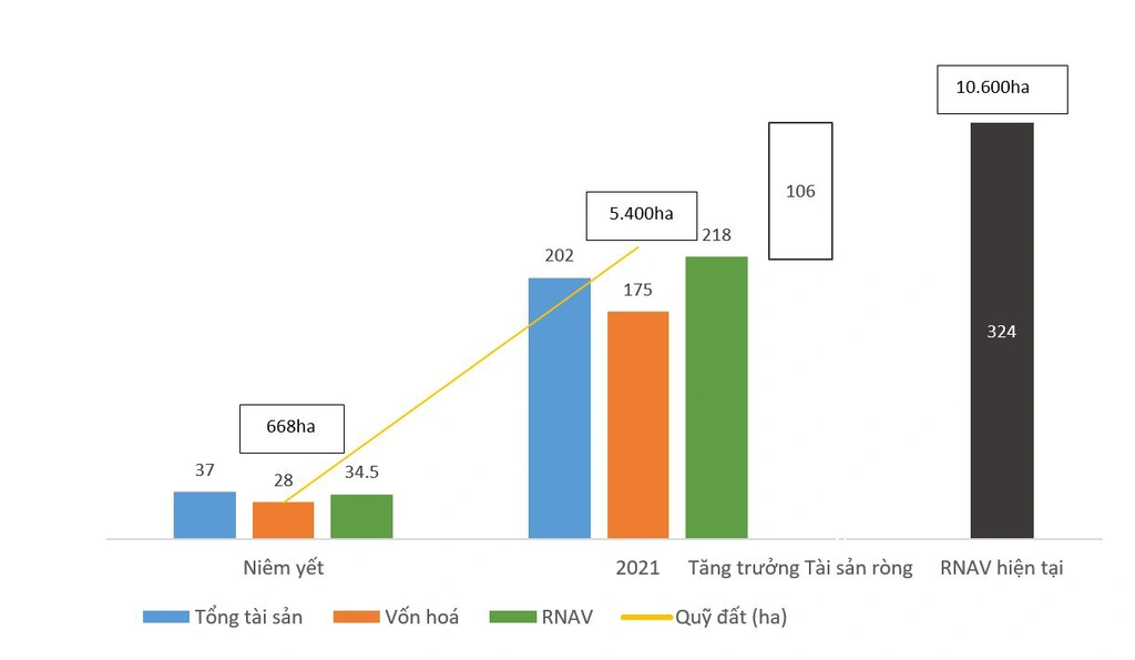 Giá trị tài sản ròng của công ty năm 2021 cũng tăng đáng kể, từ 218.000 tỷ đồng (tương đương 9,5 tỷ USD) trên quỹ đất 5.400 ha (công bố đầu năm) lên 324.000 tỷ đồng (tương đương 14,1 tỷ USD) trên quỹ đất mở rộng lên 10.600 ha (công bố cuối năm).